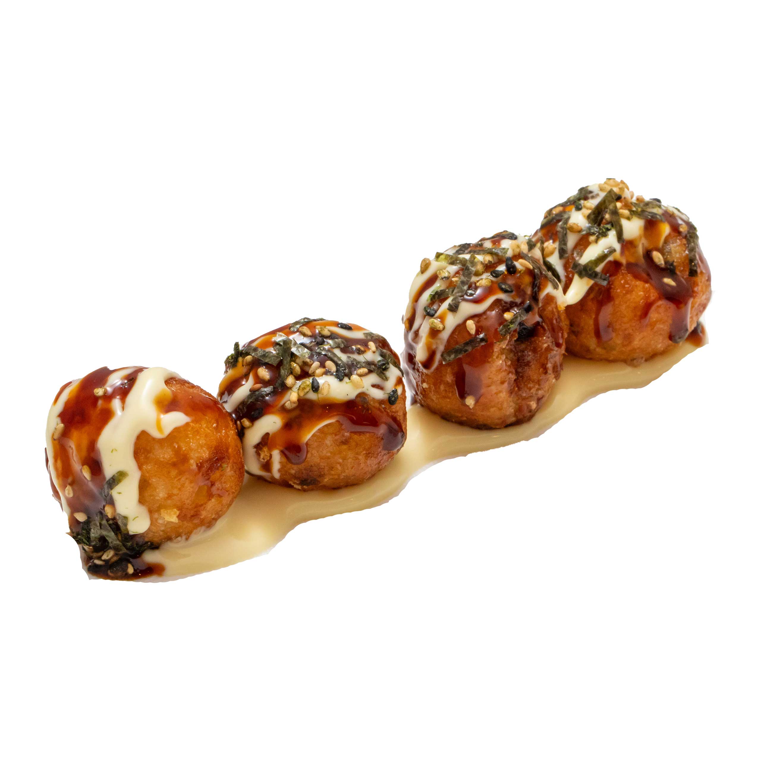 Le Takoyaki sono gustose polpette giapponesi, preparate con pastella e pezzetti di polpo. Cotte in apposite piastre sferiche, hanno una consistenza morbida all’interno e leggermente croccante all’esterno. Sono tradizionalmente guarnite con salsa takoyaki, maionese giapponese, scaglie di alga nori e katsuobushi (scaglie di tonnetto essiccato), che si muovono leggermente per il calore delle polpette appena preparate. Deliziosi come snack o street food, sono apprezzate per il loro sapore ricco e l’equilibrio tra il gusto delicato del polpo e la saporita combinazione di salse.